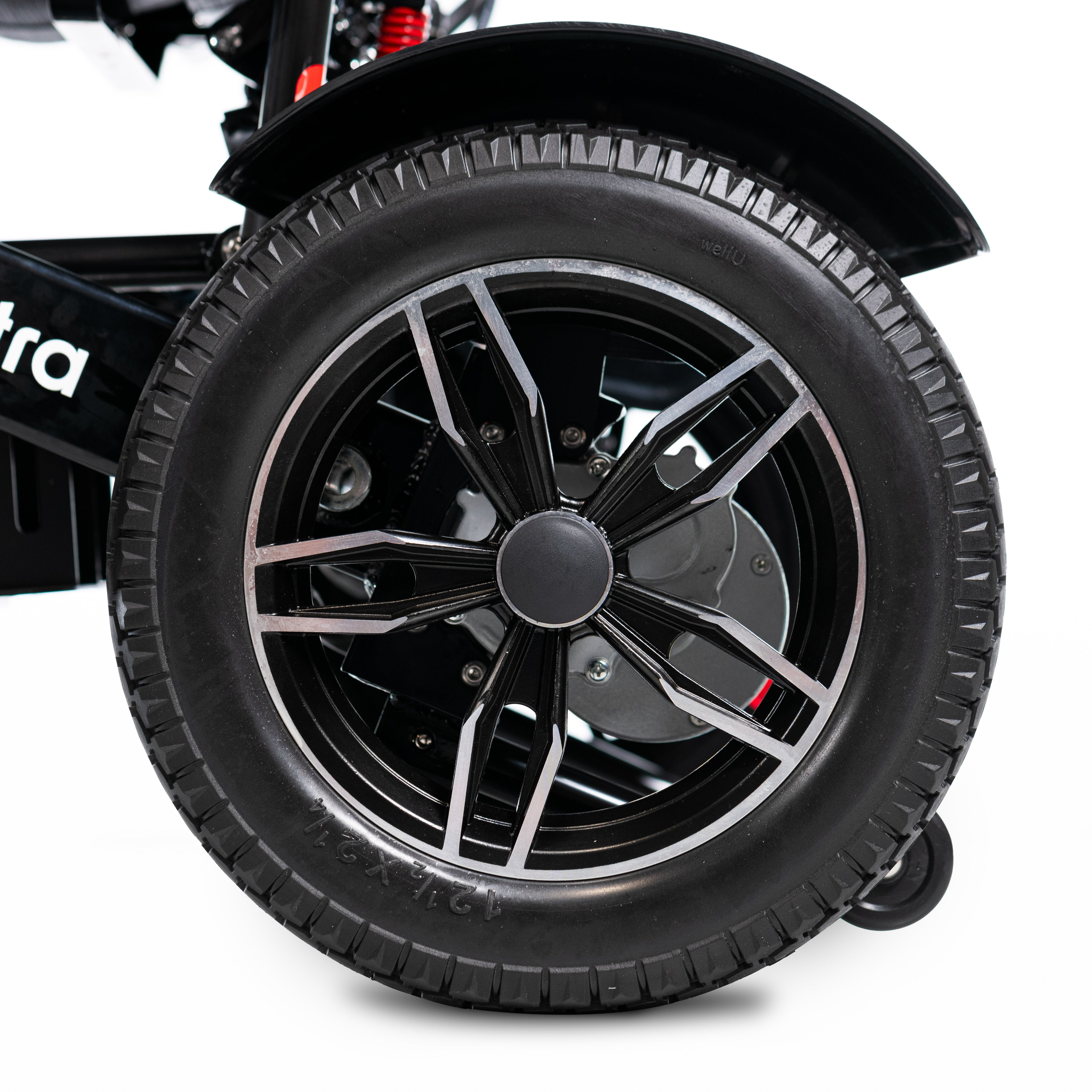 Durable 8” front and 12” rear solid tyres.