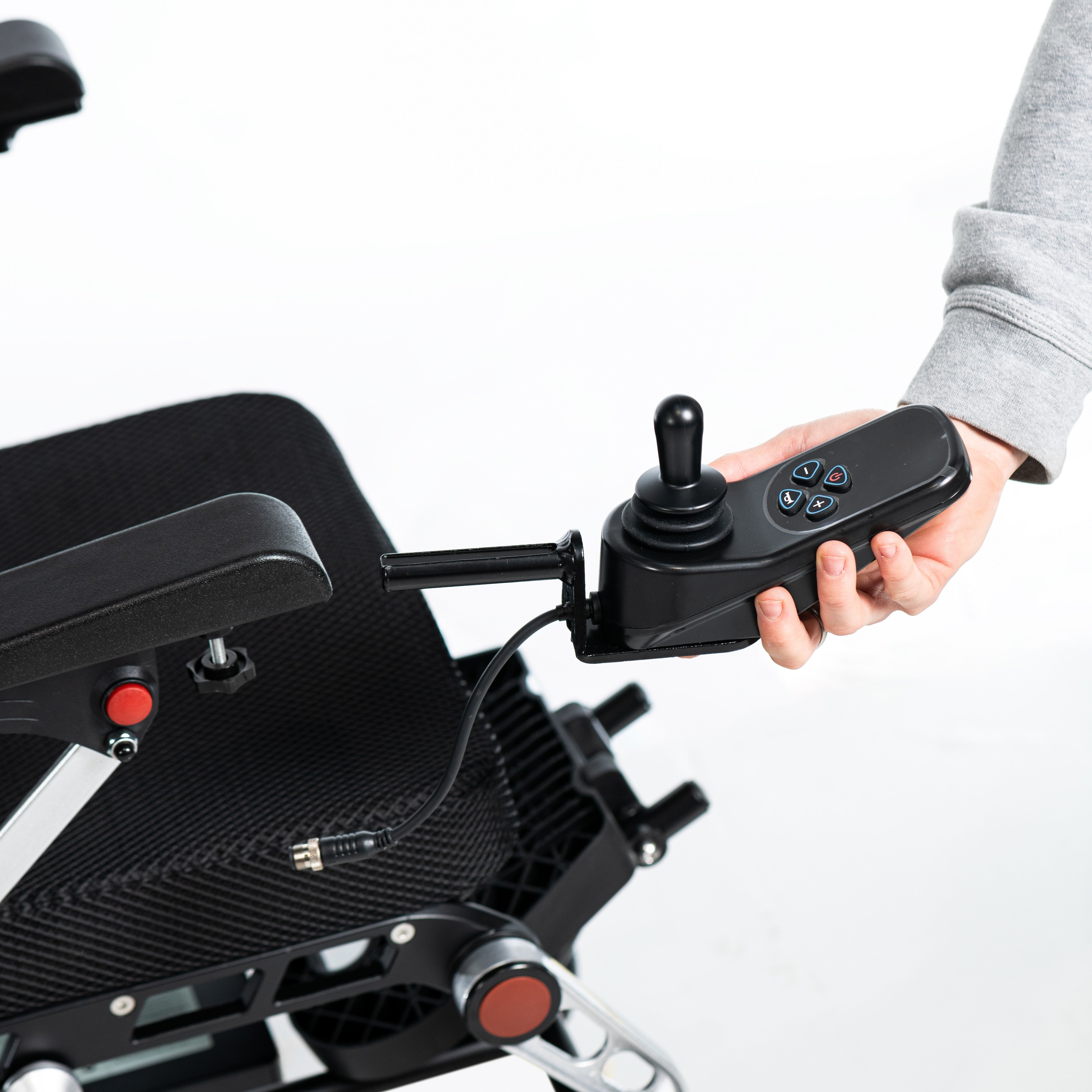 Easy to drive: Joystick with 5 speed settings, reverse, battery display, and horn (can be fitted on right or left arm).